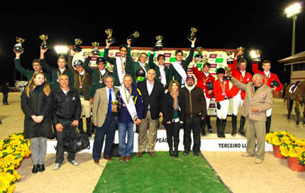 Dirigentes e chefes de equipe prestigiam as equipes campeãs Young Riders: ouro e prata para o Brasil - casacas verdes - e bronze para os poloneses - casacas vermelhas; foto: Simoni Saldanha